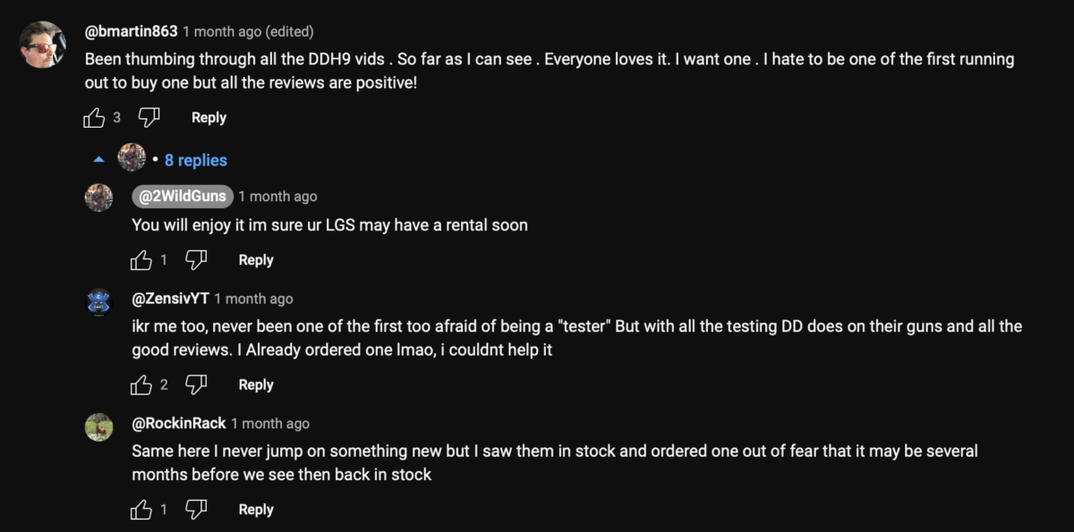 Here’s a perfect example of this in the comments to one of the videos I posted above that was a glowing endorsement of the H9 – THREE commenters are forming their opinion on this pistol because “everyone loves it,” “all the reviews are positive,” and “all the good reviews.”