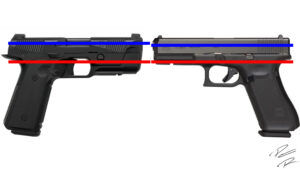 Bore-height, or bore-axis, is the measurement of the height of the barrel over the highest portion of a shooter’s grip. The higher the bore-height, the more a pistol will “flip” back under recoil whereas the lower the bore-height, the more the pistol will “push” straight back.