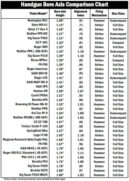 In this chart, a Hudson H9 has a bore-height listed of 1.5″ whereas a Glock 17 has a bore-height listed as 1.26″