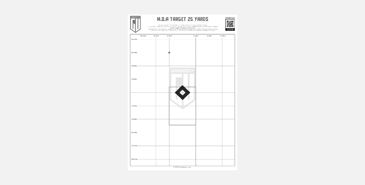 This is one of the most popular targets among my students, and I use it a ton too. Like most of the targets you’ll see here, this also has a diamond as the central point. What sets this target apart from the 25 meter/yard target (other than the longer range) are the concentric circles surrounding the center diamond, spaced out in 1-inch increments. These circles represent 1 MOA, 2 MOA, and 3 MOA to help you measure the size of your group.
