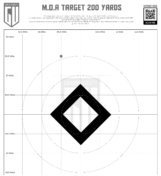 This target has a diamond twice the size of the 100 yard/meter target so it can be seen at 200 yards/meters and the circles are bigger but they still represent 1 MOA, 2 MOA, and 3 MOA.
