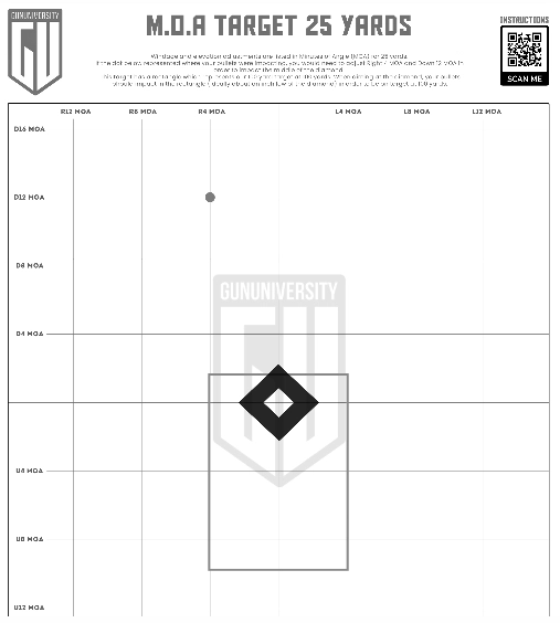 If you need help adjusting your shots on this target, I’ve included a sample dot that represents the center of a group—if this was the center of your shot group, you’d have to make the following adjustments to your sites: