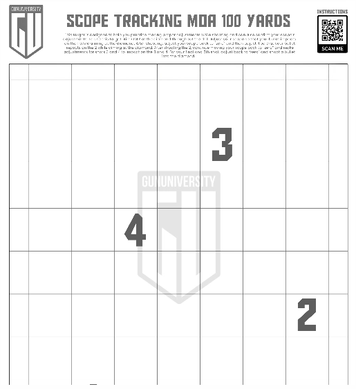 First, change your scope settings so that, even though you're aiming at the diamond, your bullet hits the spot marked "1". After that shot, reset your scope to its original setting, or "zero", and then change it so your bullet hits the "2", still while aiming at the diamond. Do this again, adjusting your scope each time to hit the "3" and "4". For your last shot, set your scope back to "zero" and try to hit right into the diamond. Remember to always aim at the diamond for ALL shots when you’re using this target—the only reason the bullets will impact elsewhere is because you made adjustments on your scope.