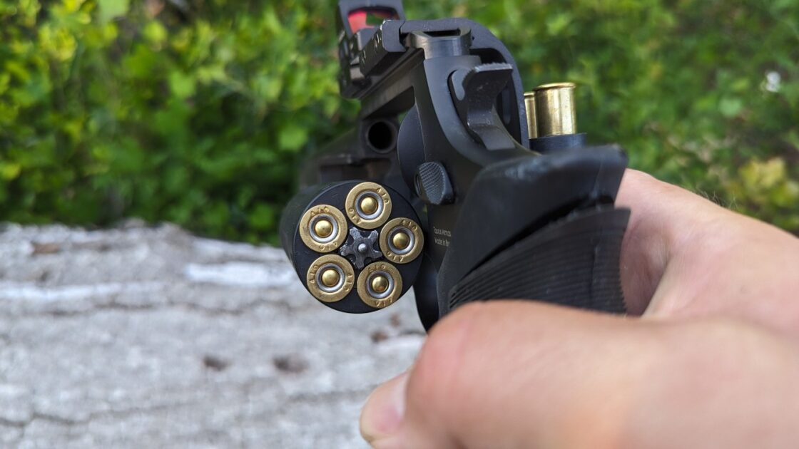When I got this gun, I thought it was pretty neat. It’s a giant revolver—massive—and it’s smile-inducing. I wanted the gun to work because the look alone entertained me. I tossed on a Vortex CCW Defender red dot and even scraped up a side saddle from a Picatinny-mounted rifle shell holder.