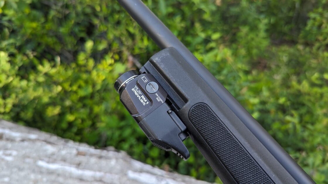 The Judge Home Defender has this great long forend/handguard that ends in a rail. This forend gives your support hand a spot to hold the gun and supports that 13-inch barrel. It makes mounting a light easy enough and makes the weapon easy to hold up and aim.